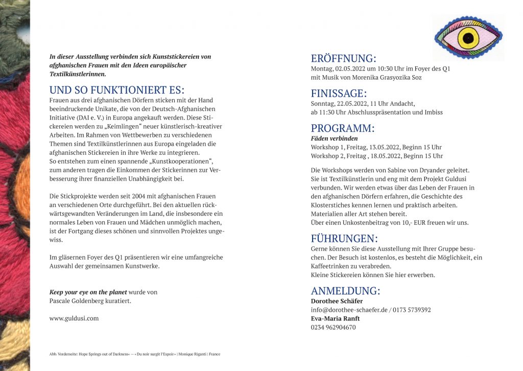 Die Ausstellung im Q1 wird realisiert in Kooperation mit dem Frauenreferat der Evangelischen Kirchengemeinde Bochum und der Residenzkünstlerin im Q1, Dorothee Schäfer. Vor Ort können die Exponate käuflich erworben werden. Ein Rahmenprogramm, welches das Thema „Bewahrung des Planeten“ aufgreift, wird zusammen mit